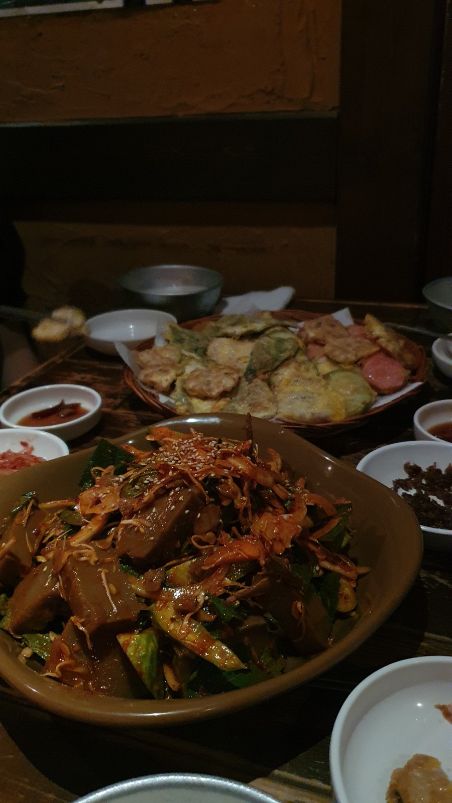 모둠전과 도토리묵에 꿀동동주 세그릇을 조지고 본격적으로 소주로 넘어가기 위해 두부김치를 주문했습니다.